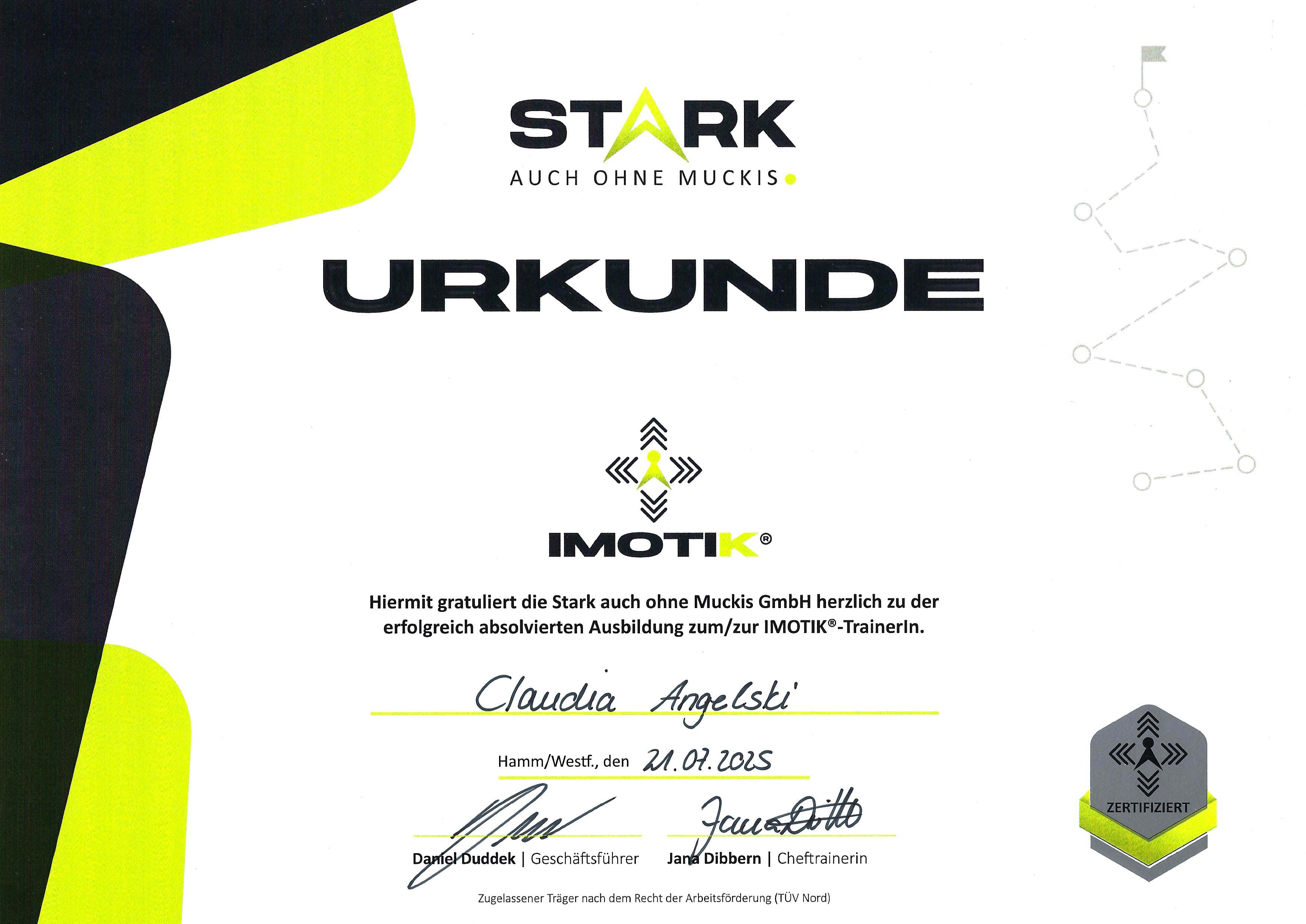 2025 habe ich mein Hobby zum Beruf gemacht und bei Stark auch ohne Muckis die IMOTIK®-Trainer Ausbildung für Mobbingprävention, Resilienz- und Lebenskompetenzstärkung absolviert.