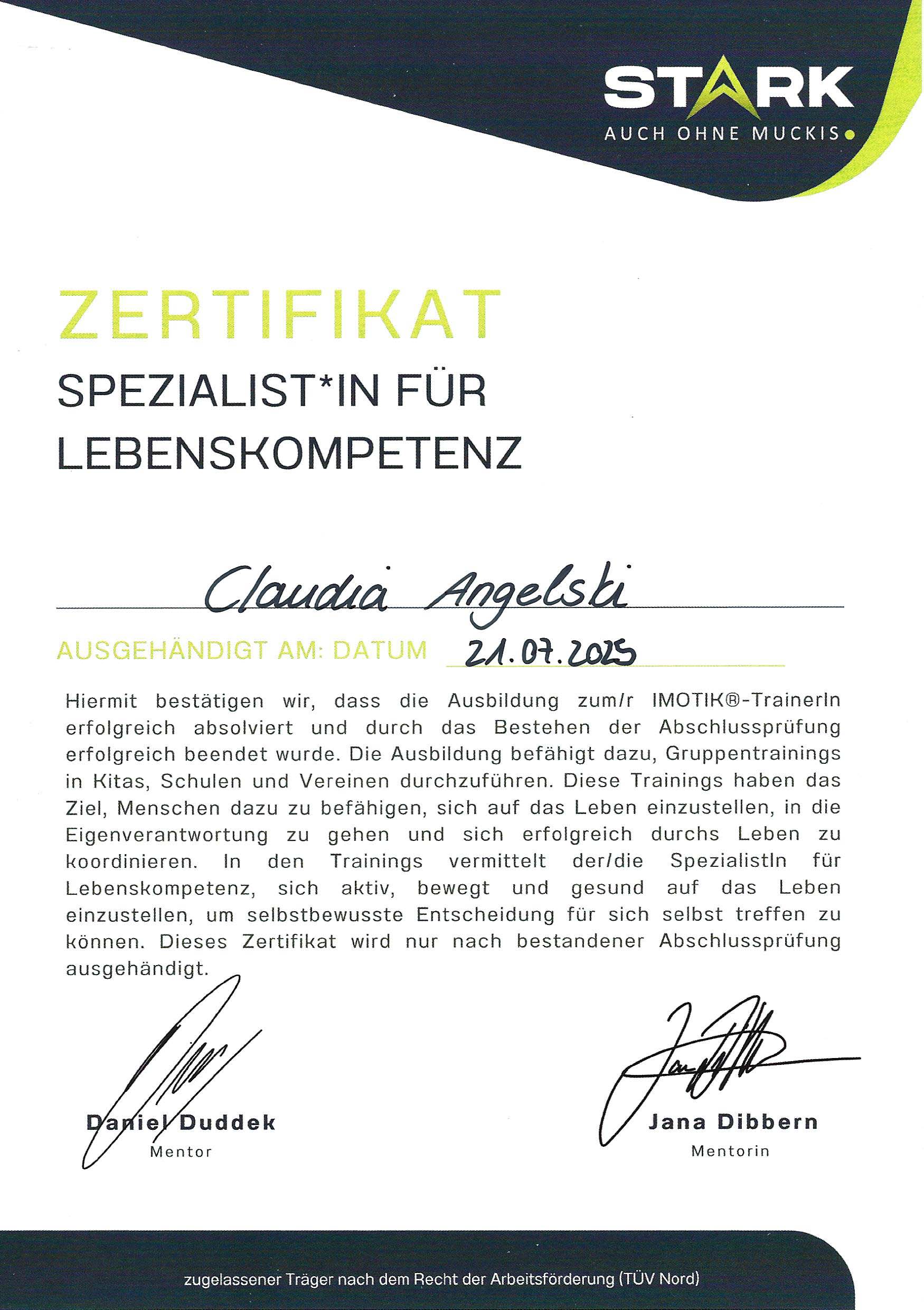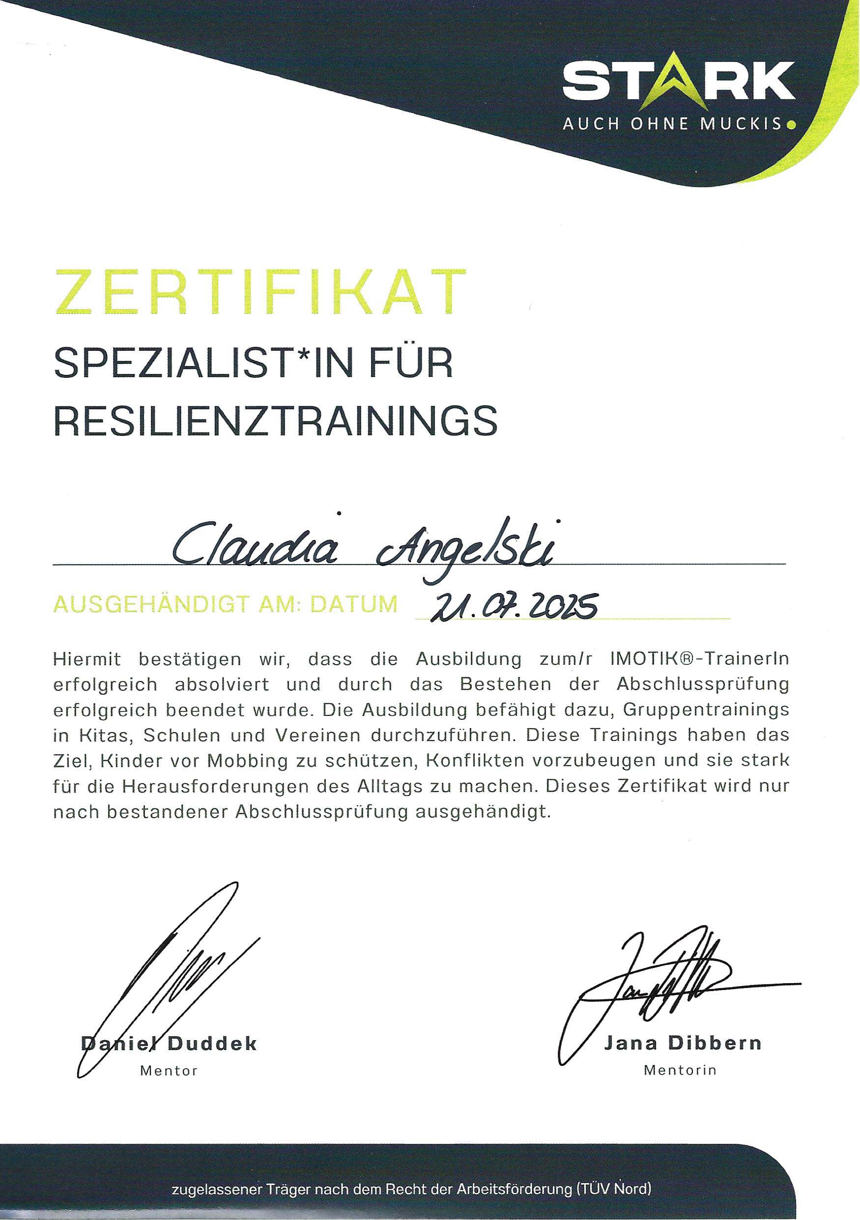 2025 habe ich mein Hobby zum Beruf gemacht und bei Stark auch ohne Muckis die IMOTIK®-Trainer Ausbildung für Mobbingprävention, Resilienz- und Lebenskompetenzstärkung absolviert.